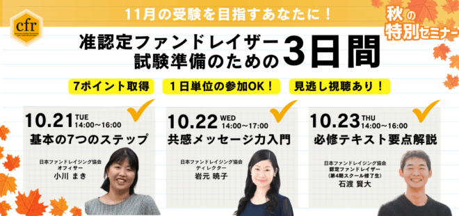【見逃し視聴あり】試験に間に合う!准認定ファンドレイザー試験準備のための3日連続・秋の特別セミナー