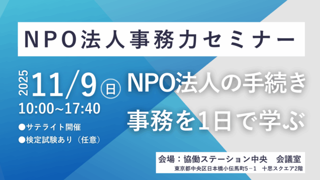 【東京開催】NPO法人の手続き・事務を1日で学ぶ 「NPO法人事務力」セミナー(検定試験あり)(全国事務支援カンファレンス主催)