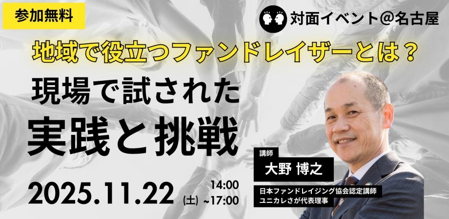 【愛知開催】3回連続セミナー 第2回<地域で役⽴つファンドレイザーとは?現場で試された実践と挑戦>(東海チャプター主催) 開催202511/22Sat. ポイント3pt 研修研修選択研修 ポスト 本研修は、日本ファンドレイジング協会東海チャプター主催の研修になります。詳細は、主催団体まで、お問い合わせください。 ●開催日時: 2025年11月22日(土)14:00 — 17:00 ●ポイント: 認定・准認定ファンドレイザーの受験資格、資格更新に必要な選択研修のポイントを 3ポイント取得可能です。 ポイント取得方法はセミナー受講後のアンケートを取りまとめ、終了後1週間をめどに通知します。 ●主催:東海チャプター お申込みはこちら